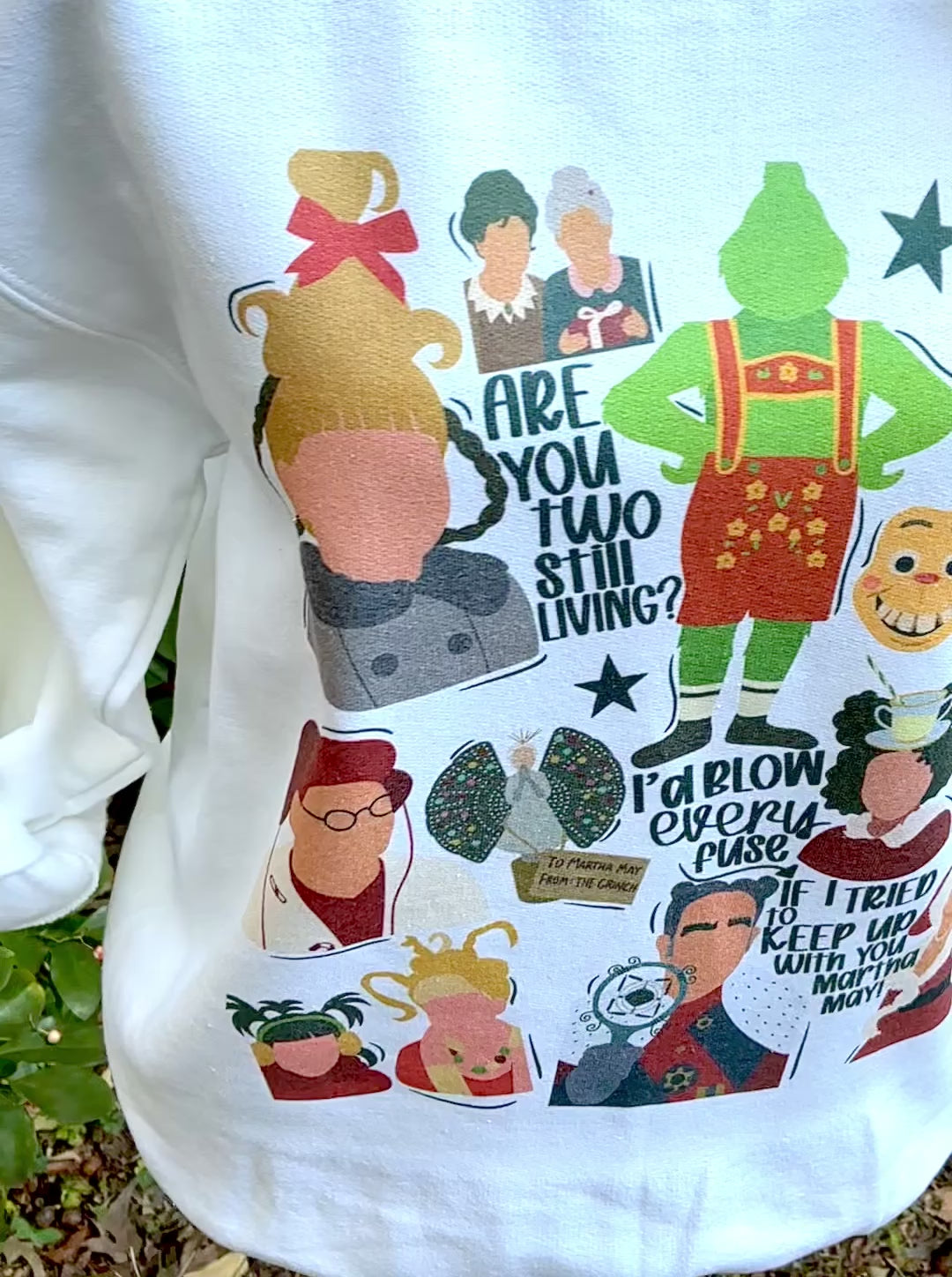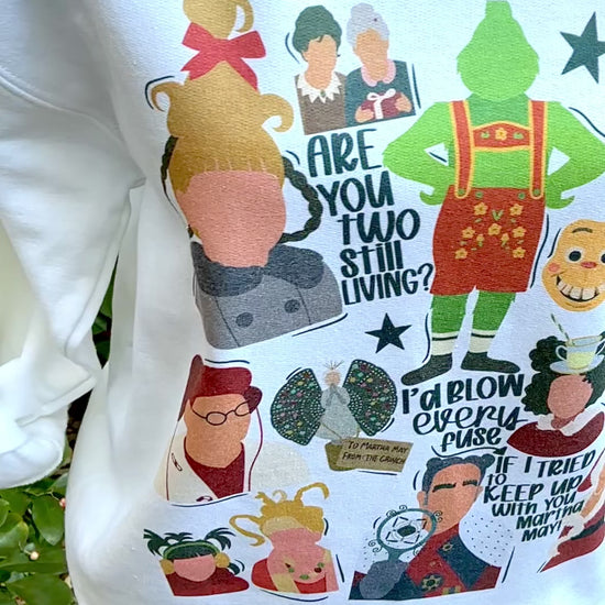 Bring the laughs this holiday season with this Movie classic-inspired Christmas sweatshirt! Featuring a collage of everyone’s favorite lookalike Who Ville characters and iconic quotes, this cozy crewneck is perfect for Christmas movie marathons, holiday parties, or sipping cocoa by the tree.