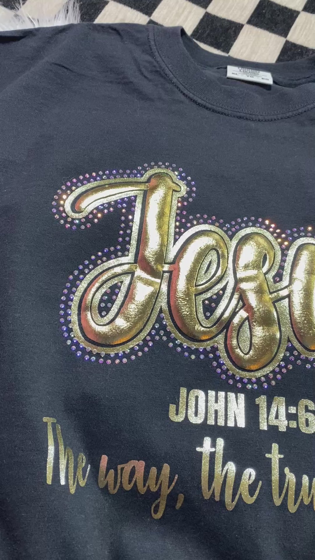 This stunning Jesus rhinestone tee features a bold metallic script design paired with John 14:6: “The way, the truth, the life.” Finished with eye-catching rhinestone bow details on both sleeves, this tee is perfect for church, worship nights, or everyday faith-filled style.